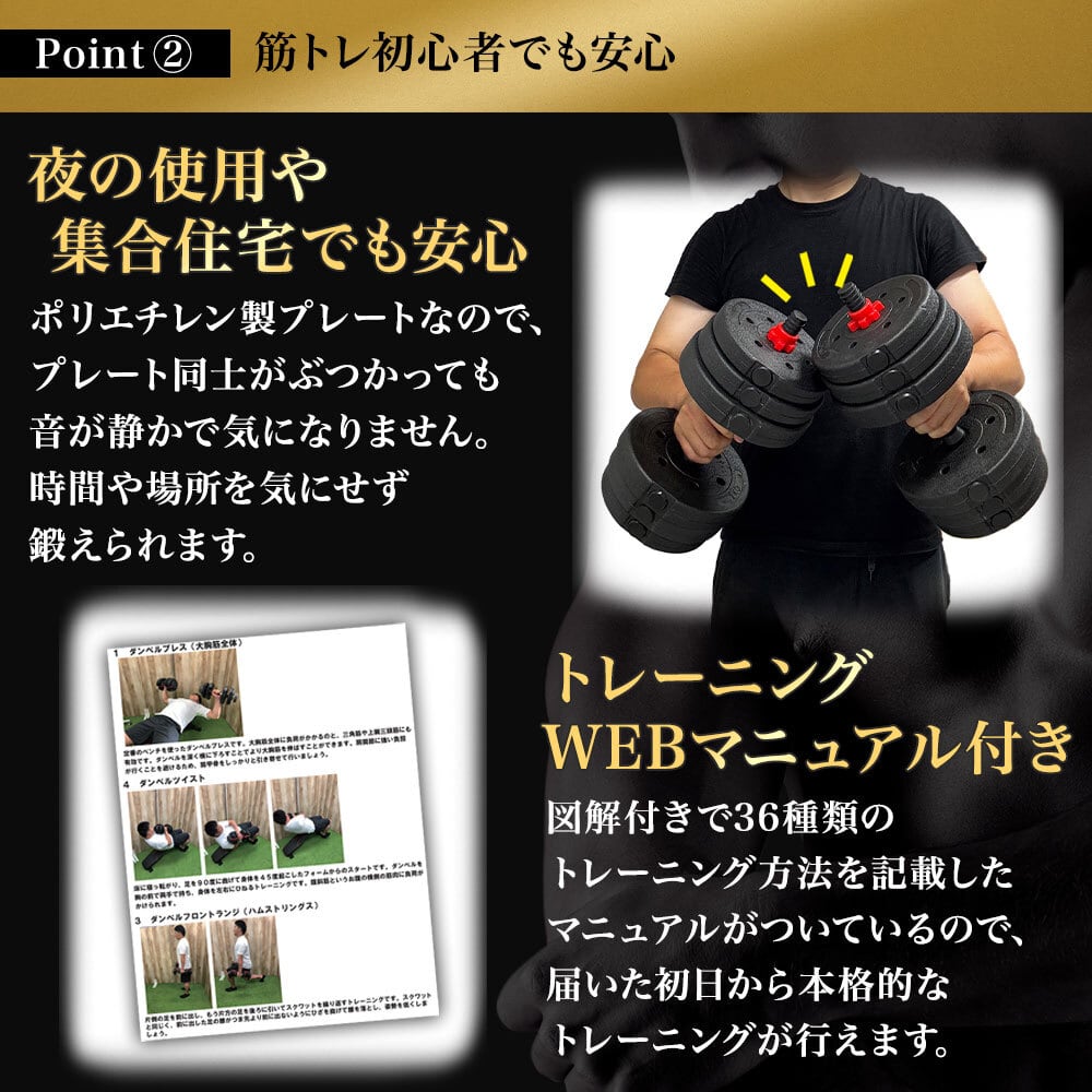 ポリエチレン製のダンベルプレートを採用。限界まで種目をこなすと、力尽きてダンベルを床に強く置いてしまうこともあると思います。
